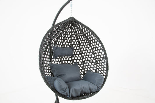 The Onyx Black Hanging Swing Pod Egg Chair - Large with deep Grey Cushions