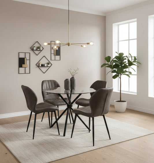 Consider how your dining set will fit with your existing décor. Looking for something that works with more traditional furniture? Our tables with Emily leather chairs bring a timeless quality. If your home leans towards contemporary styling, the velvet chair options add a touch of modern luxury.