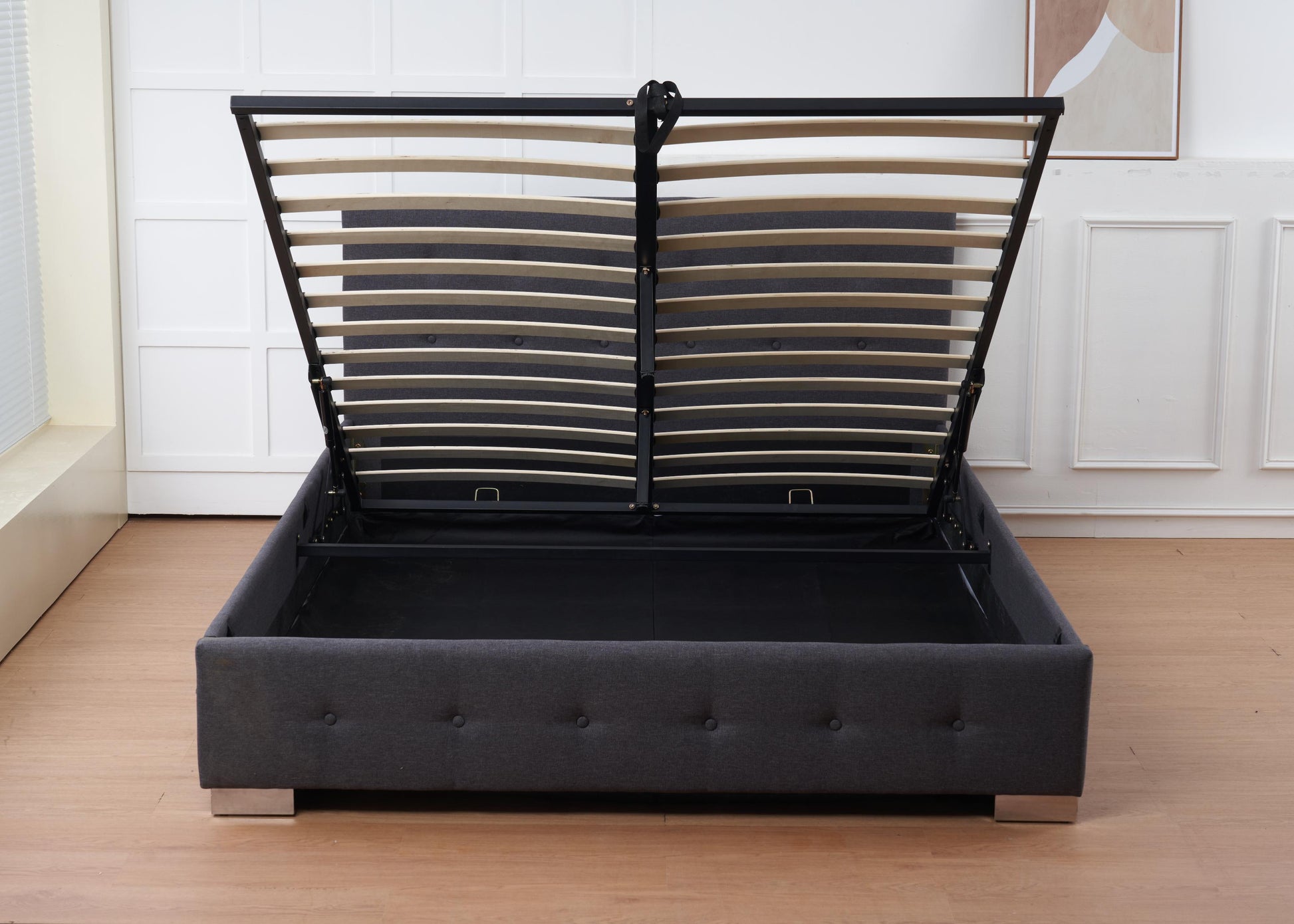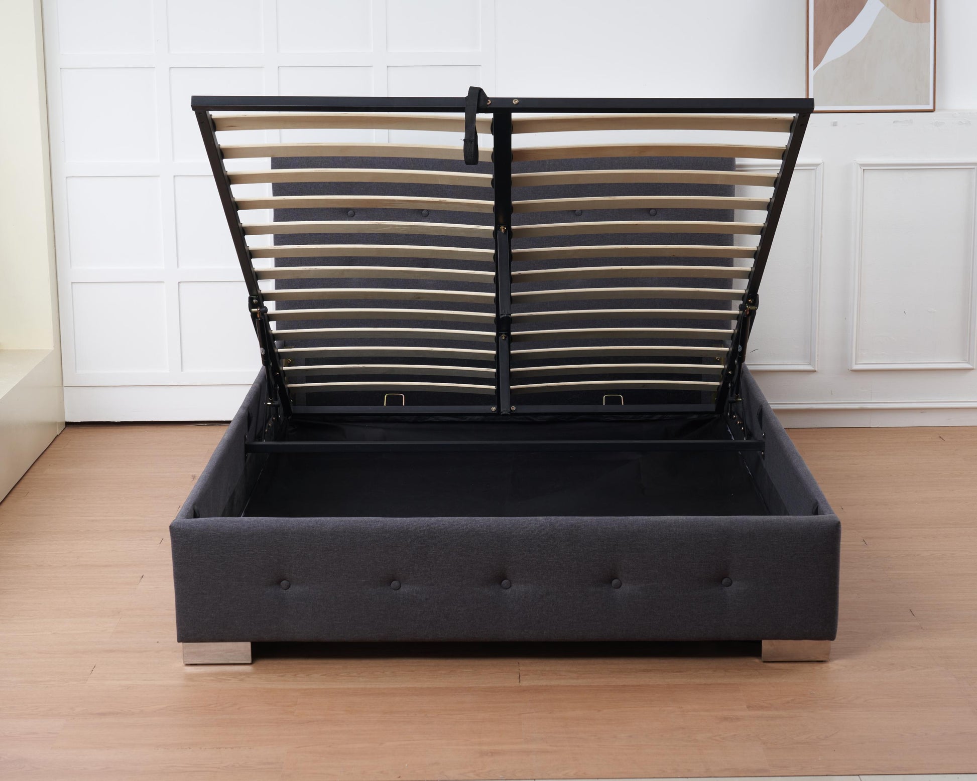 Beneath its sleek silhouette lies a spacious hidden compartment, easily accessed via a smooth gas-lift mechanism supported by sturdy metal hinges. Ideal for storing bedding, seasonal items, or anything you want tucked away but close at hand. The Oslo’s clean lines and neutral palette make it a versatile fit for both minimalist and cozy interiors, while its smart storage solution helps you reclaim your space without compromising on style.